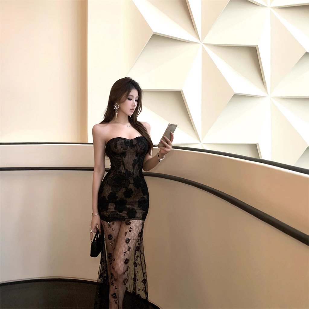 Black Sheer Lace Sequin Bandeau Dress | 8002