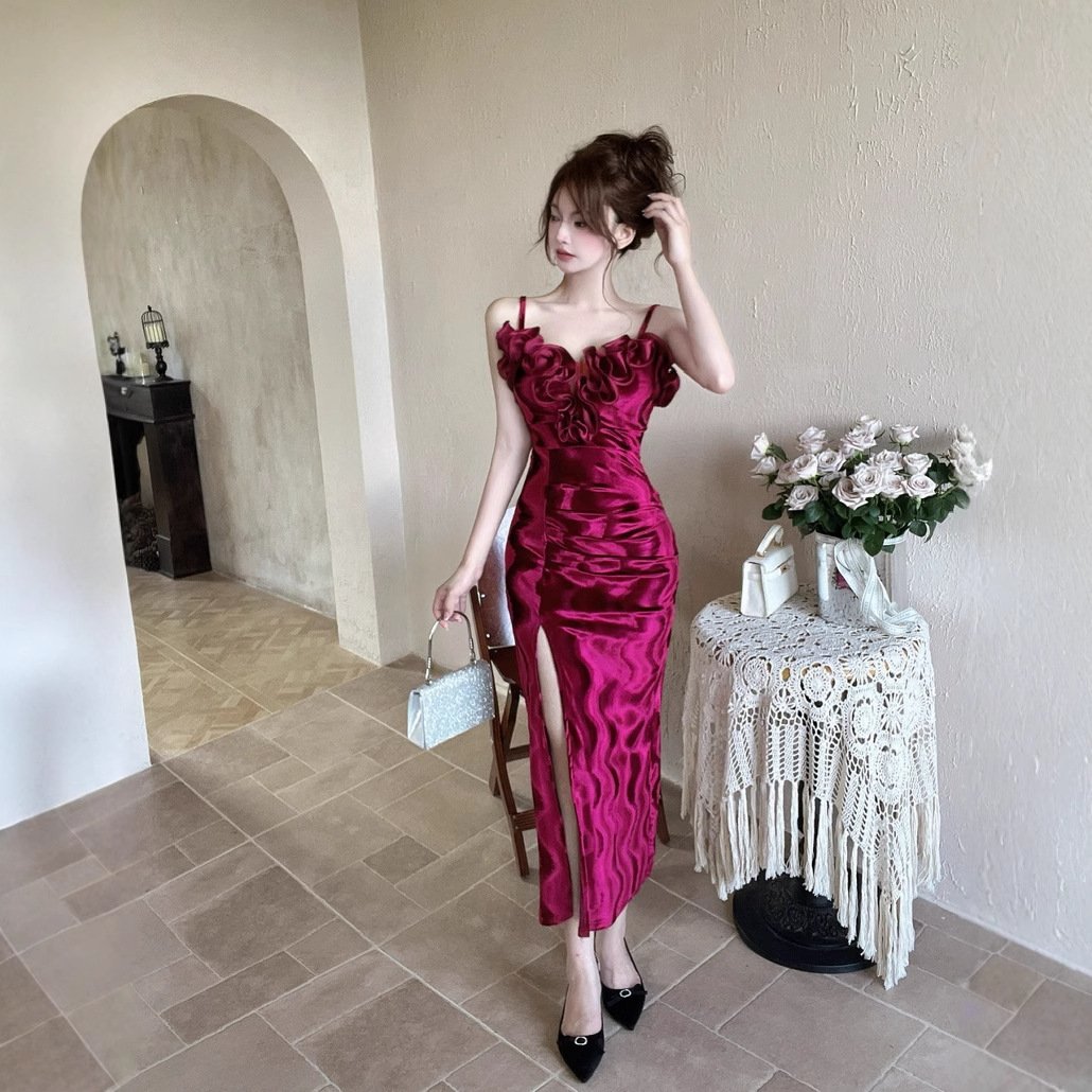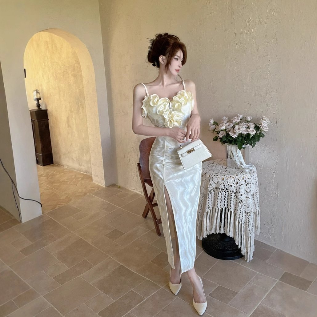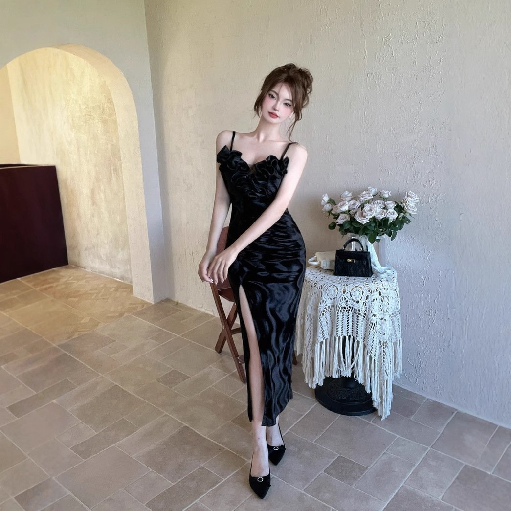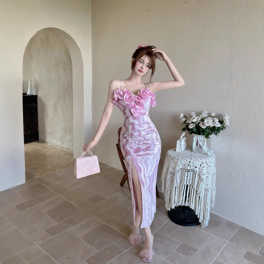 French temperament socialite sexy flower stitching long slit velvet suspenders dress | 1154