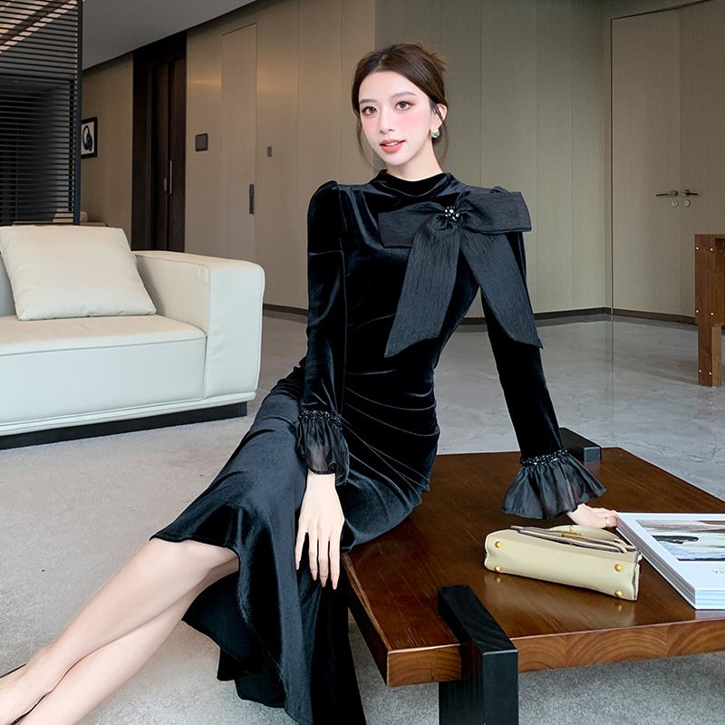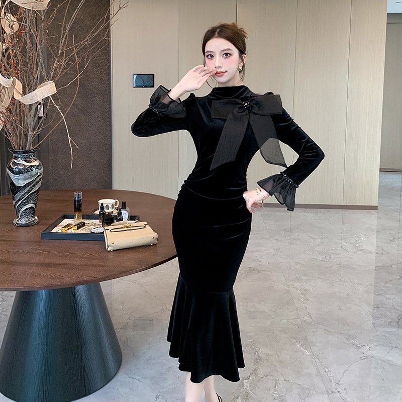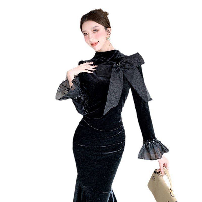 High-end exquisite temperament lady bow heavy nail diamond trumpet sleeve fishtail little black dress | 1157