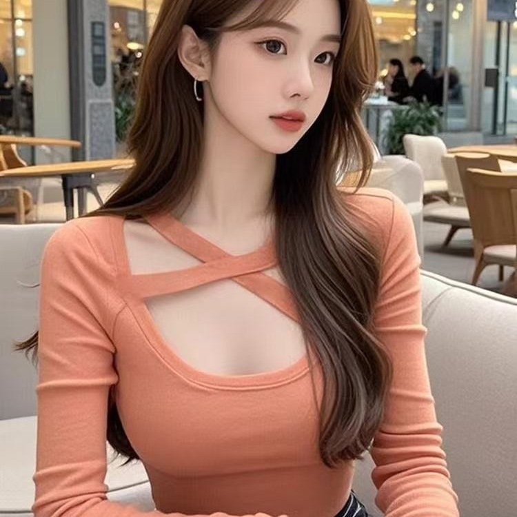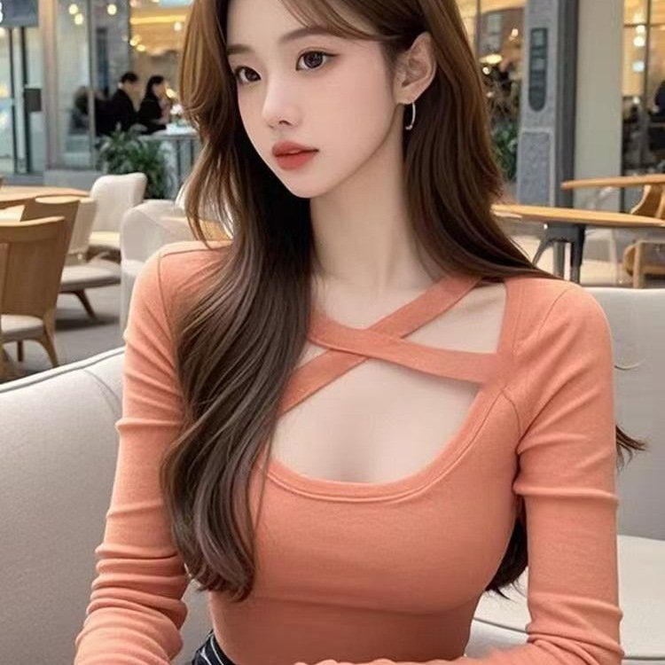 Pure Lust Sweet and Spicy Style Square Neck Cross Long Sleeve T-Shirt | 9029